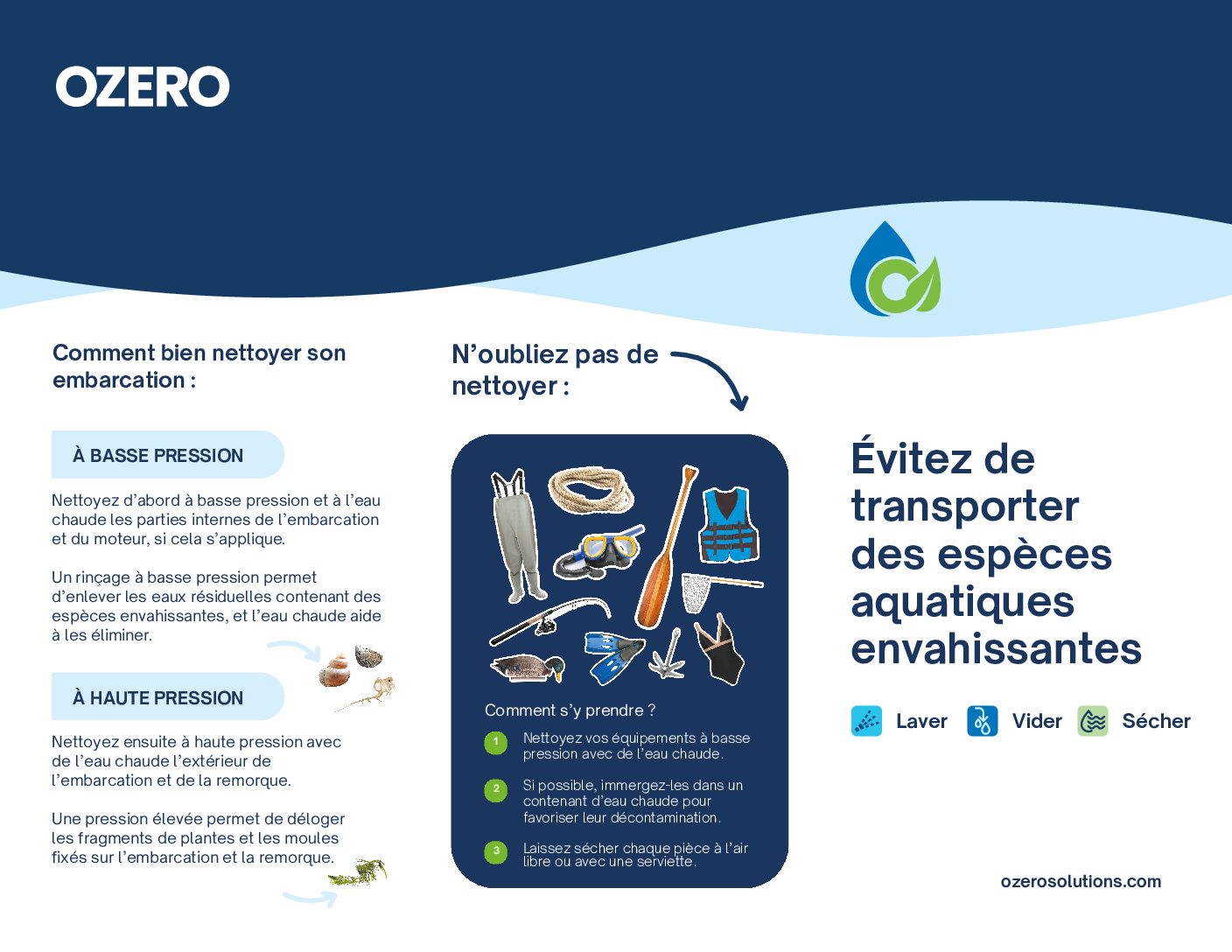 On y trouve une courte présentation de ce que sont les espèces aquatiques envahissantes (EAE), une courte présentation de leurs impacts sur les plans d’eau, ainsi qu’un rappel des étapes à réaliser pour un lavage d’embarcation réussi.