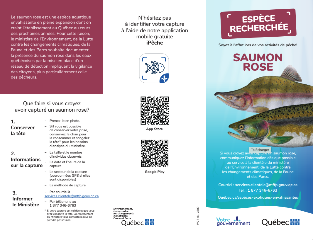 Affiche de sensibilisation portant sur le saumon rose. On encourage les pêcheurs à procéder au signalement de l’espèce et explique comment procéder. Puis, un encadré présente les distinctions entre le saumon rose, et le saumon atlantique et la truite arc-en-ciel, ces deux dernières espèces pouvant lui ressembler.